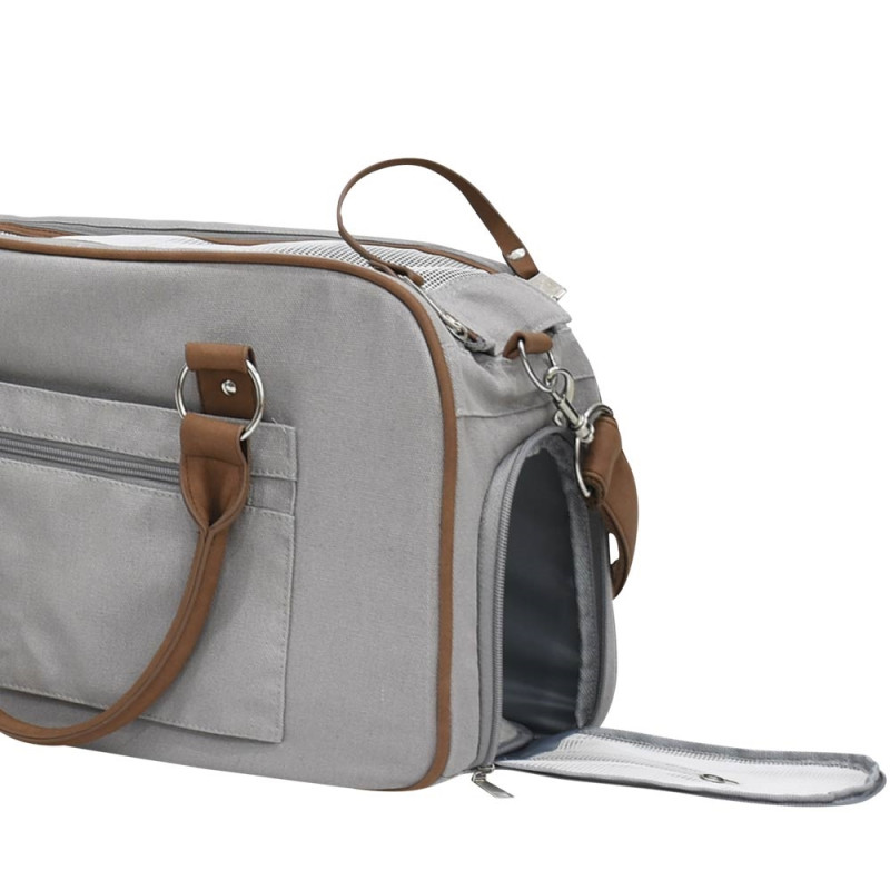 Сумка-переноска с плечовим ременем для дрібних собак та котів Perka – зручна сумка-боулер для переноски тварин вагою до 6 кг. Сумка виготовлена з міцної мікрофібри, яка зручна у догляді. Постійний приплив свіжого повітря і хорошу циркуляцію забезпечують три сітчасті вставки. Сумка оснащена трьома різними кишенями та петлею для кріплення до автокрісла чи валізи. Бічна сторона на застібці-блискавці повністю відчиняється, перетворюючи сумку на будиночок-печеру.