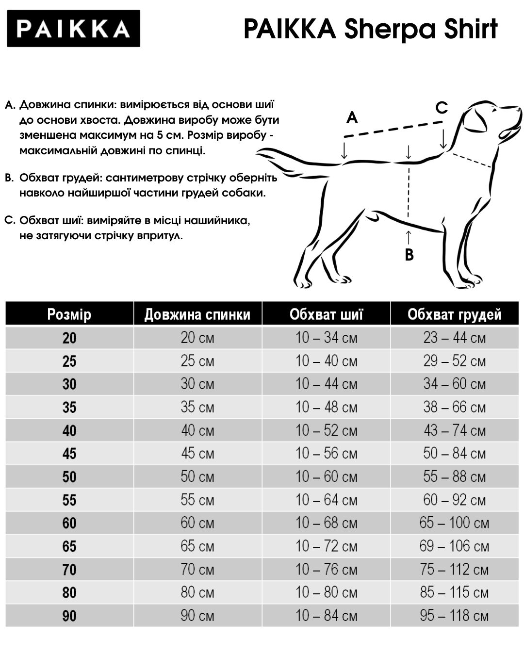 Щоб визначити базовий розмір сорочки для собак PAIKKA, виміряйте спину собаки від шиї до основи хвоста. Якщо ваш улюбленець знаходиться між двома розмірами, ми рекомендуємо вибрати більший розмір. Зверніть увагу, що розміри на таблиці розмірів є максимальними.