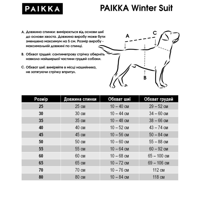 Щоб визначити базовий розмір костюма PAIKKA, виміряйте спину собаки від шиї до