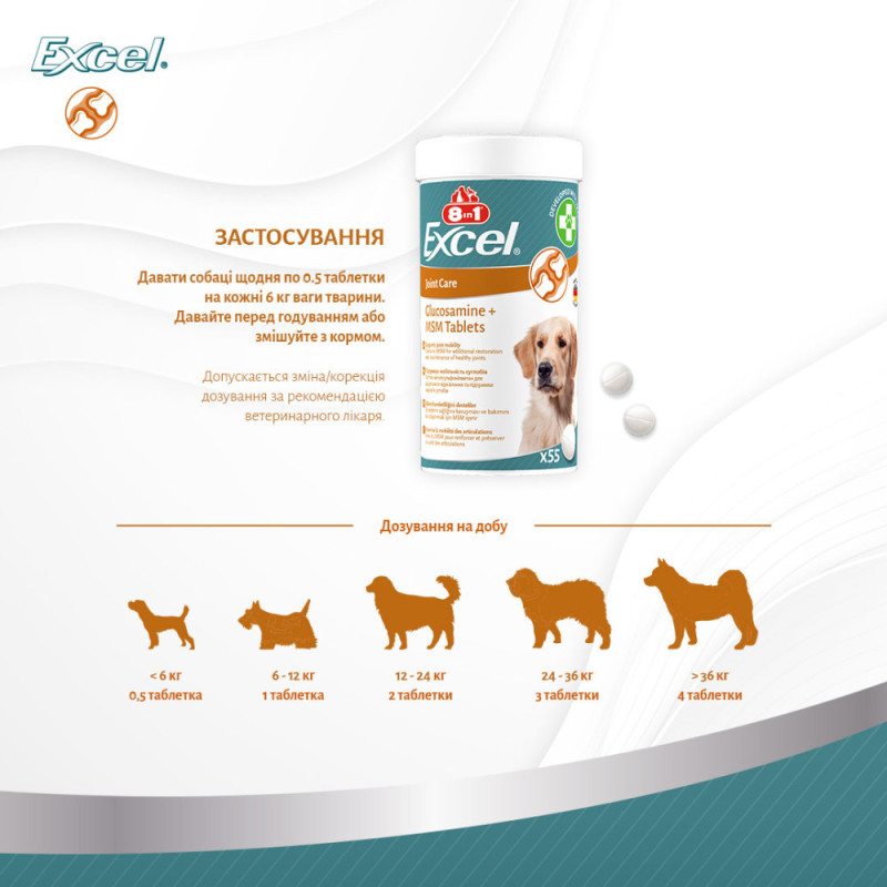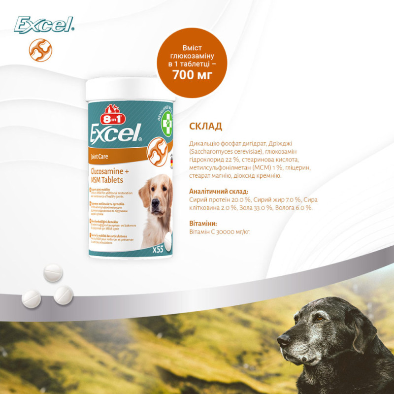 8in1 Excel Glucosamine+MSM Комплексная добавка с глюкозамином для восстановления суставов собак