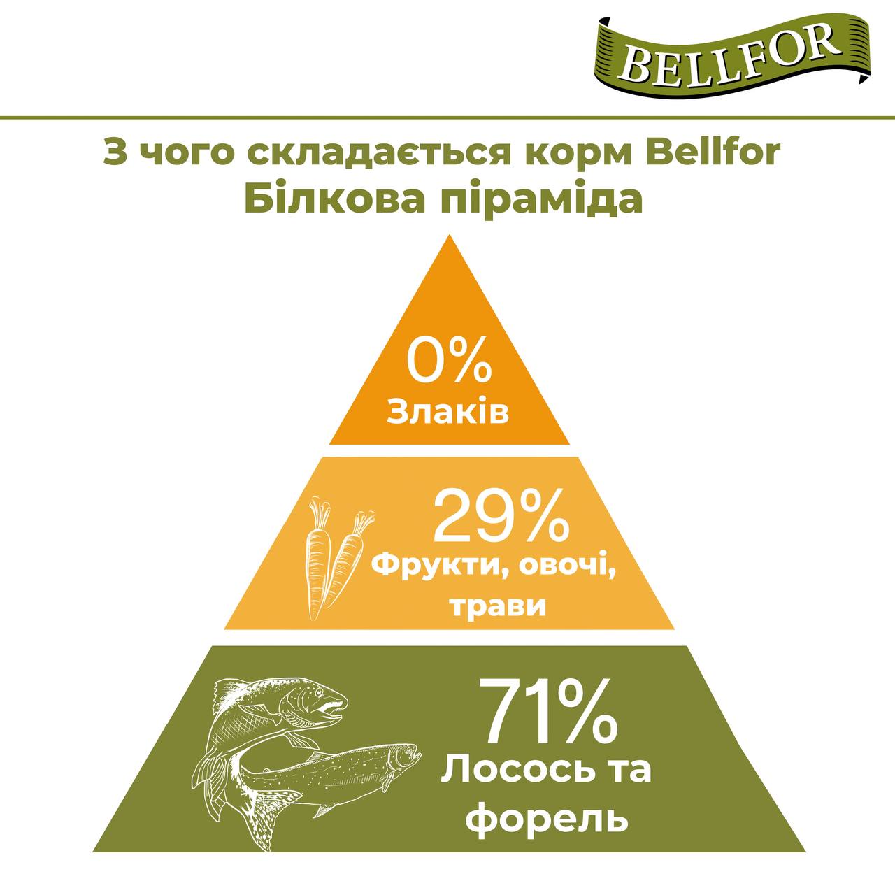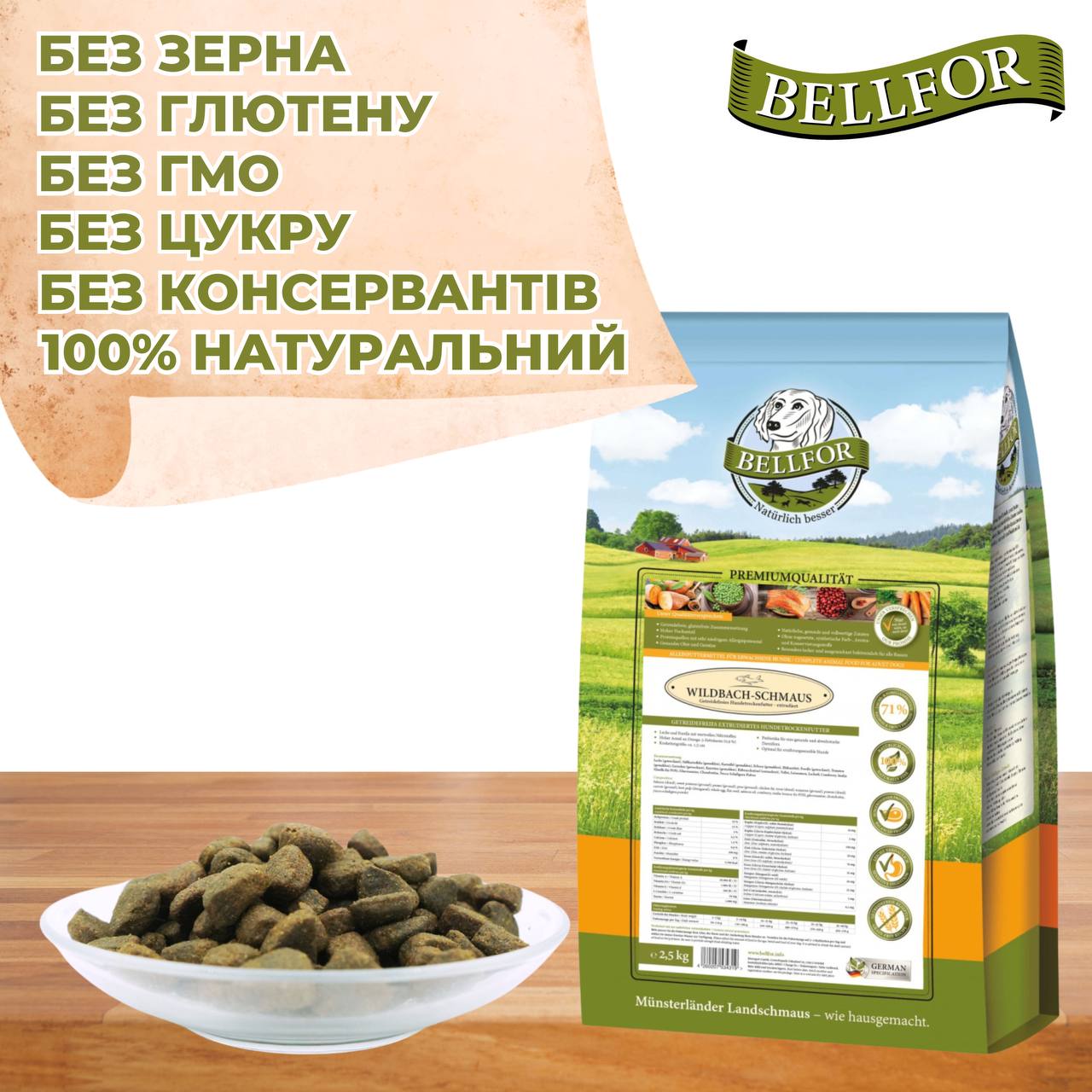 Крафтовый немецкий холистик с лососем и форелью Bellfor Wildbach Schmaus - это высококачественный беззерновой экструдированный корм с крокетой до 1,5 см, разработанный в соответствии с потребностями средних и крупных собак весом до 60 кг.
