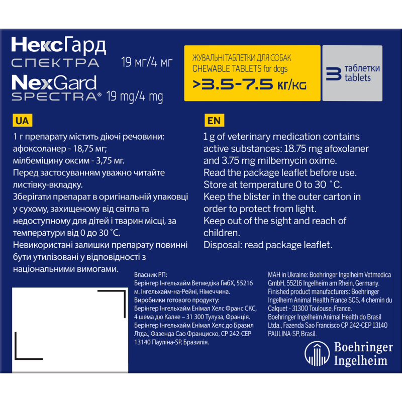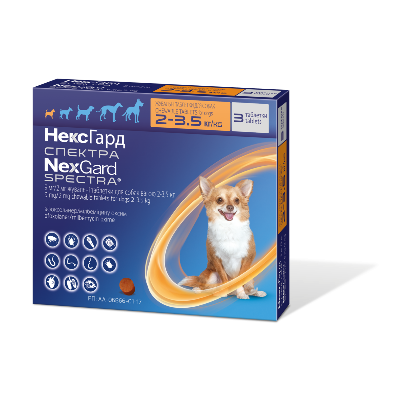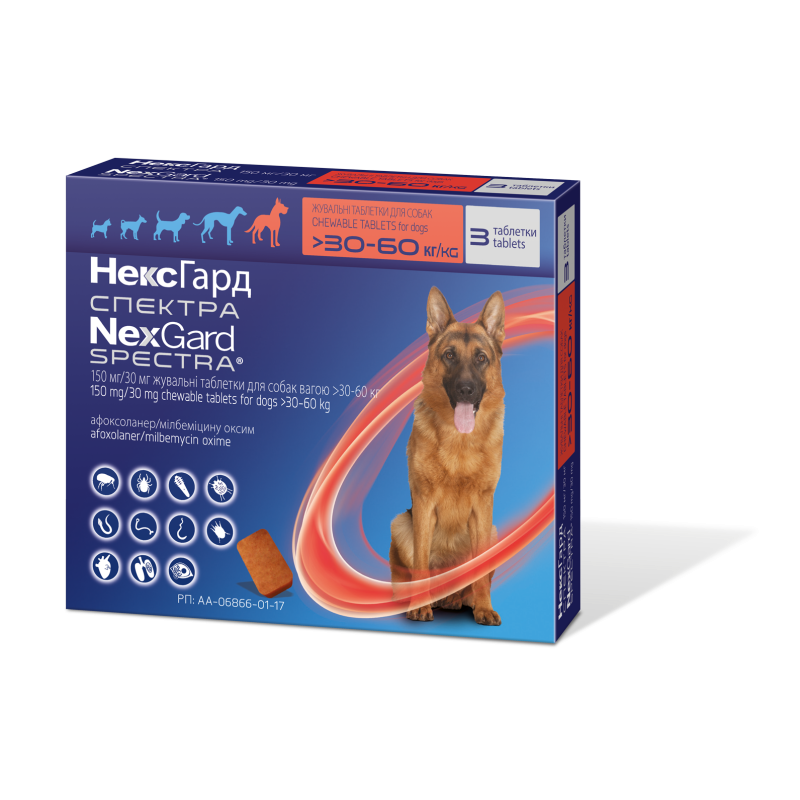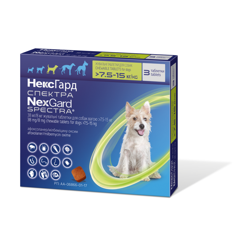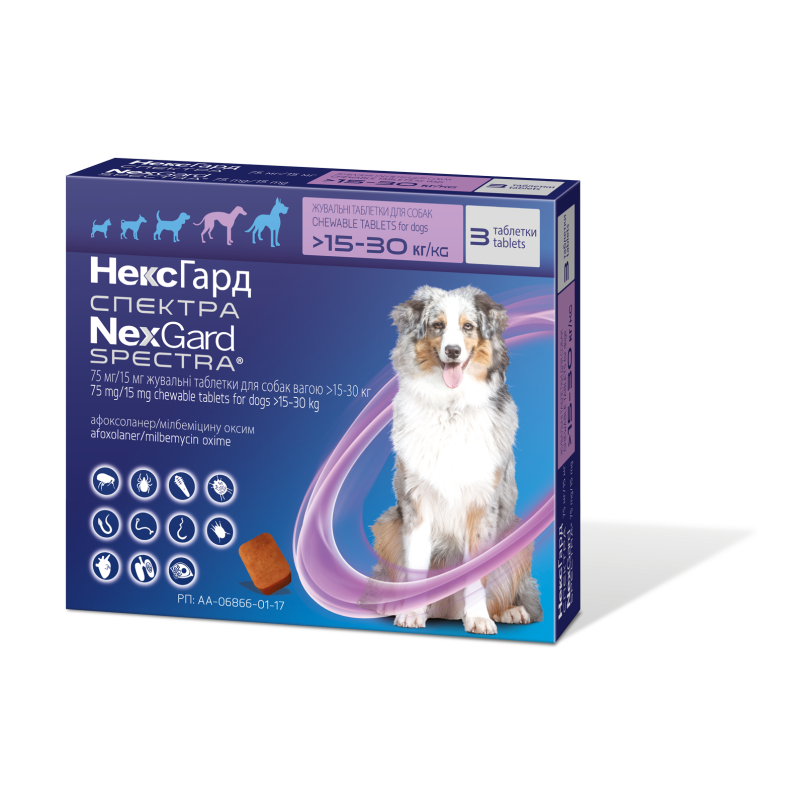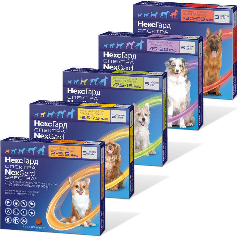 NexGard Spectra - жевательная таблетка для собак против наиболее распространенных внешних и внутренних паразитов собак. NexGard Spectra помимо действия на внешних паразитов, борется против гельминтов - аскарид, власоглавов, анкилостом, а также защищает собак от дирофиляриоза.