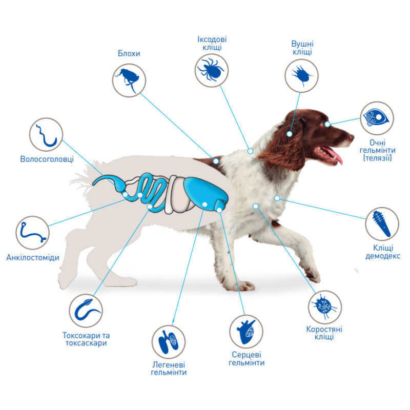 Лечение акарозов собак, которые вызваны клещами и блохами, лечение собак при заражении желудочно-кишечными нематодами, комплексная терапия аллергического дерматита, профилактика дирофиляриоза собак.