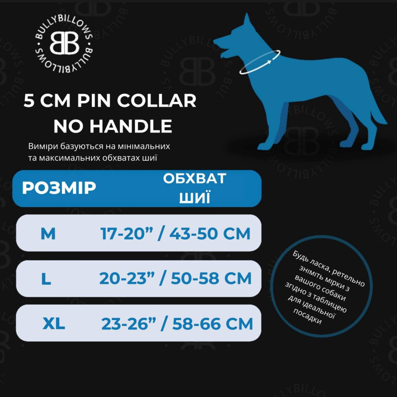 Сверхпрочный широкий классический ошейник для собак с мягкой подкладкой BullyBillows Pin Collar No Handle 5 cm разработан для воспитания рабочих служебных собак, корректировки поведения у домашних доминантных собак и формирования правильного поведения у реактивных собак. Ошейник оснащен антикоррозийной фурнитурой: фронтальной петлей D-Loop из нержавеющей стали диаметром 6 мм, которая выдерживает нагрузку более 2 тонн и караульным типом замка, который делает невозможным самораскрытие.