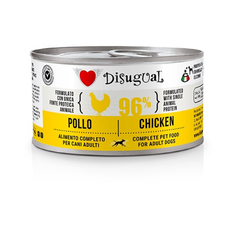 Disugual Dog MonoProtein 96% Chicken Монопротеиновый консервированный беззерновой корм для собак Паштет из Курицы - это высококачественный натуральный влажный безглютеновый корм для собак класса холистик от итальянского бренда Disugual, известного производителя высококачественного натурального питания для собак и кошек без добавления искусственных ароматизаторов, консервантов и других химических веществ.