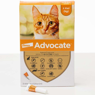 Адвокат Спот-он для котов и хорьков Капли для котов и хорьков от блох, гельминтов, кожных и ушных клещей Advocate® - это комплексное средство для котов и хорьков, которое одновременно борется с внутренними и внешними паразитами. Препарат быстро уничтожает блох, их личинки, кожных и ушных клещей, а также сердечных и кишечных гельминтов, включая аскарид, анкилостом и волосоголовцев. Он эффективно уменьшает зуд и предотвращает повреждение кожи, обеспечивая длительную защиту животного. Активные компоненты - имидаклоприд и моксидектин - действуют быстро и надежно, обеспечивая коту защиту в течение месяца после однократного нанесения. Препарат производит известная немецкая фармацевтическая компания Elanco, обеспечивая высокие стандарты качества. Адвокат® позволяет одновременно защитить любимца от широкого спектра паразитов внутри и снаружи, что делает его удобным и эффективным решением для ежемесячной профилактики и лечения. Преимущества препарата Advocate®: Advocate® обеспечивает комплексную защиту: блохи (Ctenocephalides felis), ушные клещи (Otodectes cynotis), чесотка (Sarcoptes scabiei var. canis), демодекоз (Demodex canis), гастроинтестинальные нематоды (Toxocara canis, Ancylostoma caninum, Uncinaria stenocephala, Toxascaris leonina, Trichuris vulpis), дирофиляриоз (Dirofilaria immitis).Advocate® одновременно лечит и предупреждает смешанные паразитарные инвазии.Advocate® эффективен при аллергическом блошином дерматите.Advocate® при ежемесячном применении обеспечивает профилактику дирофиляриоза и предотвращает повторную инвазию нематодами.Advocate® безопасен для беременных и лактирующих животных.Advocate® удобно наносить: препарат наносится непосредственно на кожу, равномерно распределяется вдоль позвоночника. Состав: 10% имидаклоприд (100 мг) и 1% моксидектин (10 мг) на 1 мл Показания к применению: Котам и хорькам для лечения и профилактики смешанных паразитарных инвазий: для лечения и предотвращения заражения блохами (Ctenocephalides felis)лечение отодектоза (Otodectes cynotis)лечение чесотки (Sarcoptes scabiei var. canis)лечение демодекоза (Demodex canis)профилактика дирофиляриоза (эффективен против личинок L3 L4 Dirofilaria immitis)лечение и профилактика гастроинтестинальных нематодозов (личинки (L4), незрелые и зрелые Toxocara canis, Ancylostoma caninum, Uncinaria stenocephala, имаго Toxascaris leonina и Trichuris vulpis) Препарат может использоваться как один из компонентов при лечении аллергического блошиного дерматита. Дозировка: Минимальная терапевтическая доза: 10 мг/кг массы животного имидаклоприда и 1 мг/кг массы животного моксидектина, что эквивалентно 0,1 мл Адвоката на 1 кг живого веса животного. Advocate для котов и хорьков весом до 4 кг - 0,4 мл Advocate для котов весом от 4 до 8 кг - 0,8 мл Способ применения: Только для наружного применения. Извлеките одну пипетку из упаковки. Держите пипетку в вертикальном положении, снимите колпачок. Разделите шерсть между лопатками так, чтобы была видна кожа. Разместите конец пипетки на кожу, сильно сожмите пипетку несколько раз, чтобы содержимое наносилось порционно и непосредственно на кожу. Содержимое пипетки необходимо нанести в 3-4 точки вдоль позвоночника: начиная между лопатками и заканчивая у корня хвоста. При каждом нанесении необходимо раздвигать шерсть, чтобы была видна кожа. Препарат по возможности наносить на неповрежденную кожу. Не выдавливайте большое количество препарата в одно место, чтобы раствор не стекал вниз. Препарат можно применять беременным и лактирующим самкам. Леч