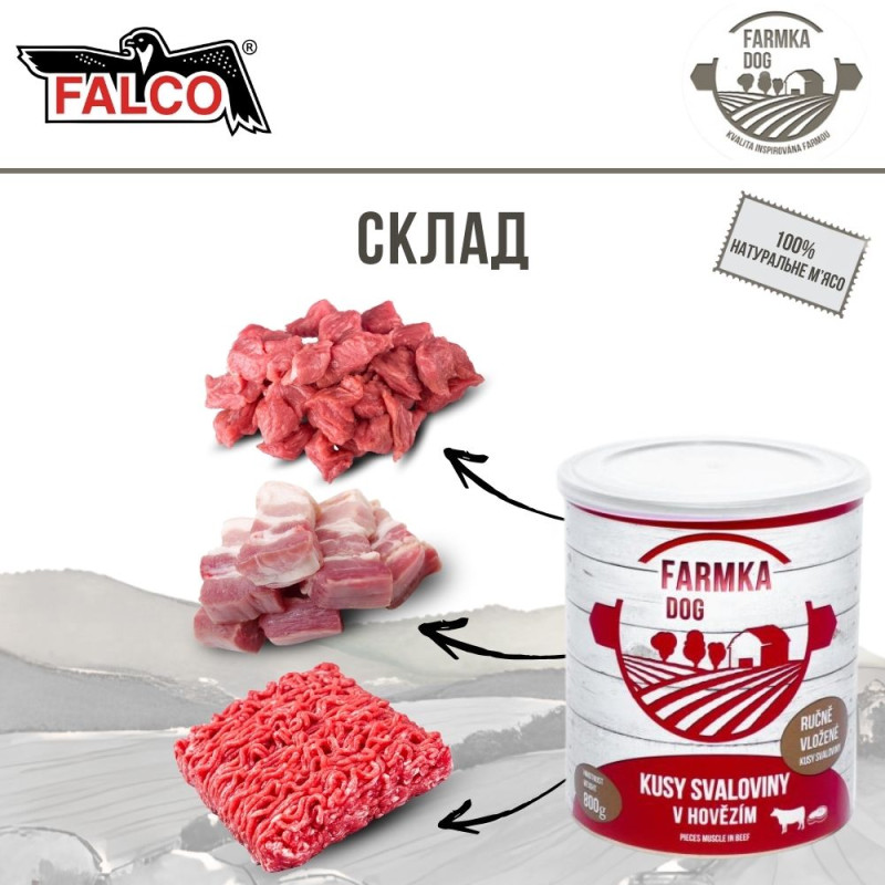 мяса для собак Куски Свинины и Говядины в Говяжьем Фарше FALCO FARMKA Dog 100%