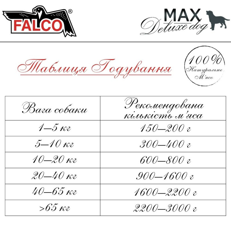 Когда хочешь дать своей собаке не просто еду, а настоящее удовольствие - выбирай FALCO MAX Deluxe Dog. Это рубленное мясо с отборными субпродуктами и специально гидротермически обработанными костями, которые легко раздавливаются пальцами. Без искусственных примесей, только чистый натуральный мясной вкус, от которого даже самый привередливый пес оближет миску!