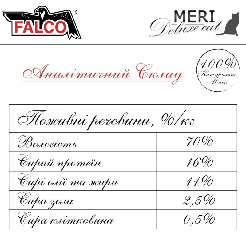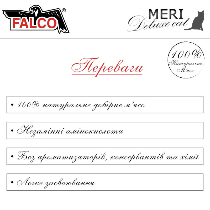 котов FALCO MERI Deluxe Cat только естественный аромат и вкус натурального мяса