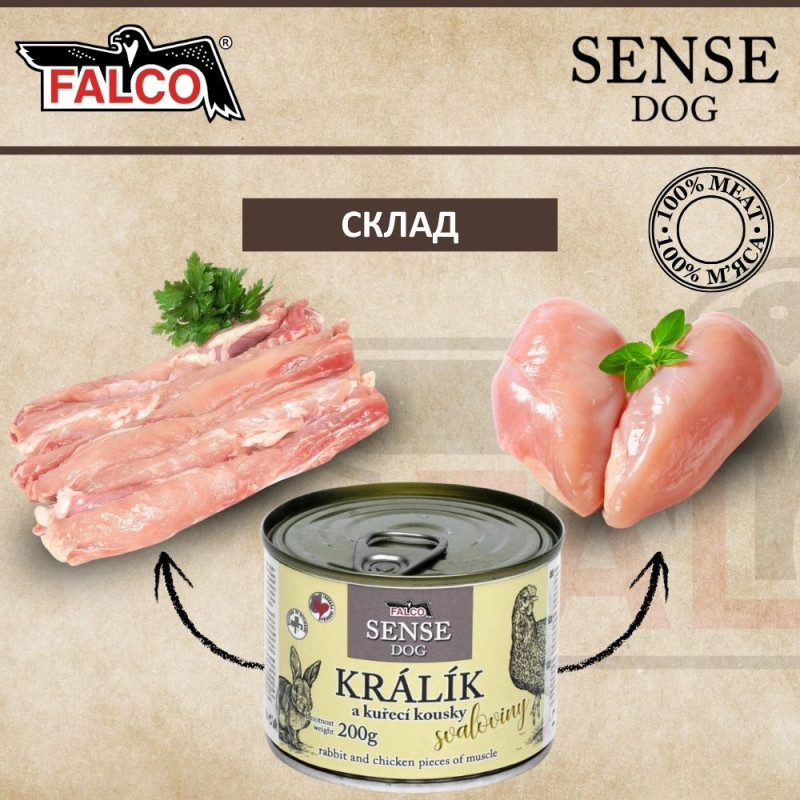 Ключевые преимущества консервированного мяса для собак с чувствительным пищеварением Кролик с Курицей FALCO SENSE DOG 100% Meat Rabbit & Chicken: