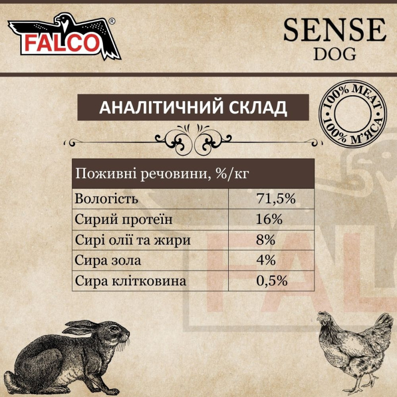 Состав консервированного мяса для собак с чувствительным пищеварением Кролик с Курицей FALCO SENSE DOG 100% Meat Rabbit & Chicken: 50% кролик, 50% курицы.