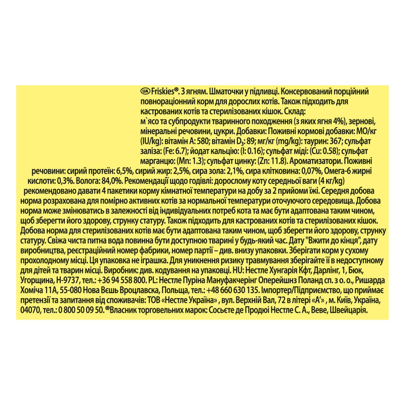 Friskies Lamb in Gravy Влажный корм для взрослых котов Кусочки с ягненком в подливе