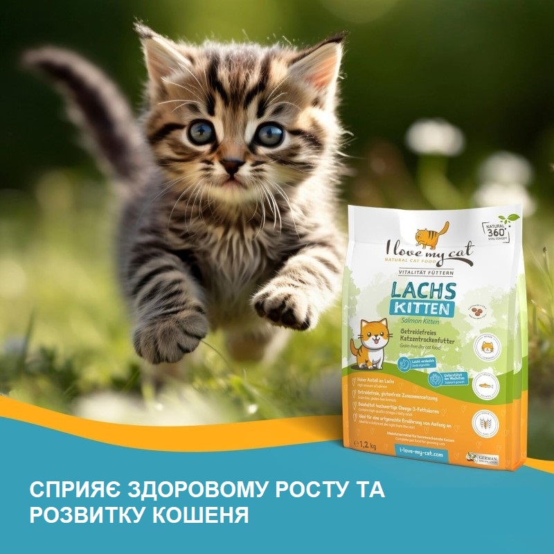 Крафтовый немецкий холистик со свежим лососем I Love my cat Kitten Salmon - это высококачественный безглютеновый экструдированный гипоаллергенный корм для котят с непереносимостью животного белка со специальной крокетой размером до 0,6 см.