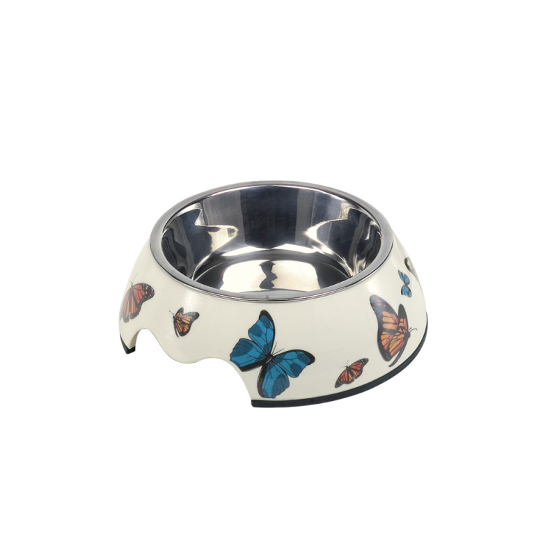 Антискользящая меламиновая миска для собак Бабочки Butterfly - надежная и безопасная миска для вашего любимца. Миска сочетает в себе меламиновый съемный корпус с яркими узорами в виде бабочек и чашу из нержавеющей стали, устойчивую к ударам, которую невозможно разбить или сломать, что обеспечивает долговечность использования и безопасность для вашего четвероногого друга. Миска не поглощает запахов пищи, не меняет вкус блюд и абсолютно нетоксична. Антискользящее дно с силиконовым кольцом обеспечит устойчивость миски на полу. Модель "Butterfly" можно использовать в посудомоечной машине.