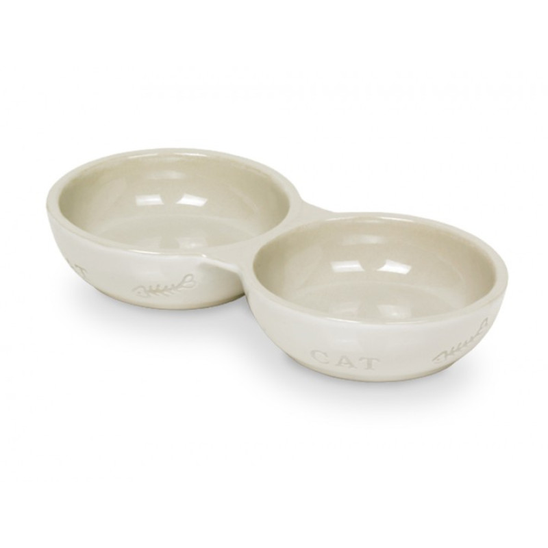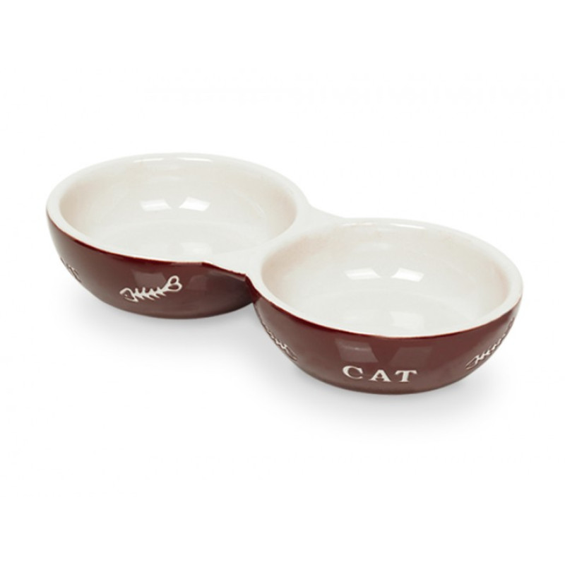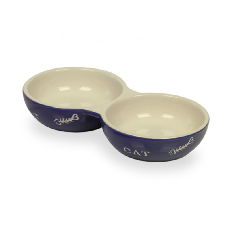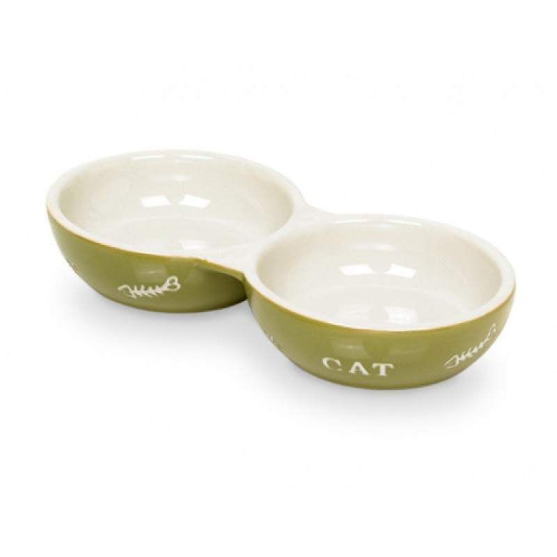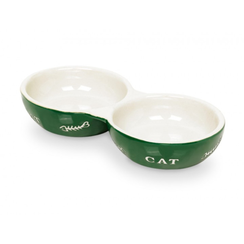 Двойная керамическая миска для котят и кошек Рыбная кость Cat - изысканная миска для вашего любимца, изготовленная из качественной керамики. Лучшее решение, когда в квартире живут несколько любимцев. Яркий тематический дизайн с рыбьей костью, что так нравится котикам, дополнит любой интерьер. Миска не поглощает запахов пищи, не меняет вкус блюд и абсолютно нетоксична. Керамическая миска достаточно тяжелая, что предотвращает скольжение миски по полу. Классическая керамическая миска требует ручного ухода.