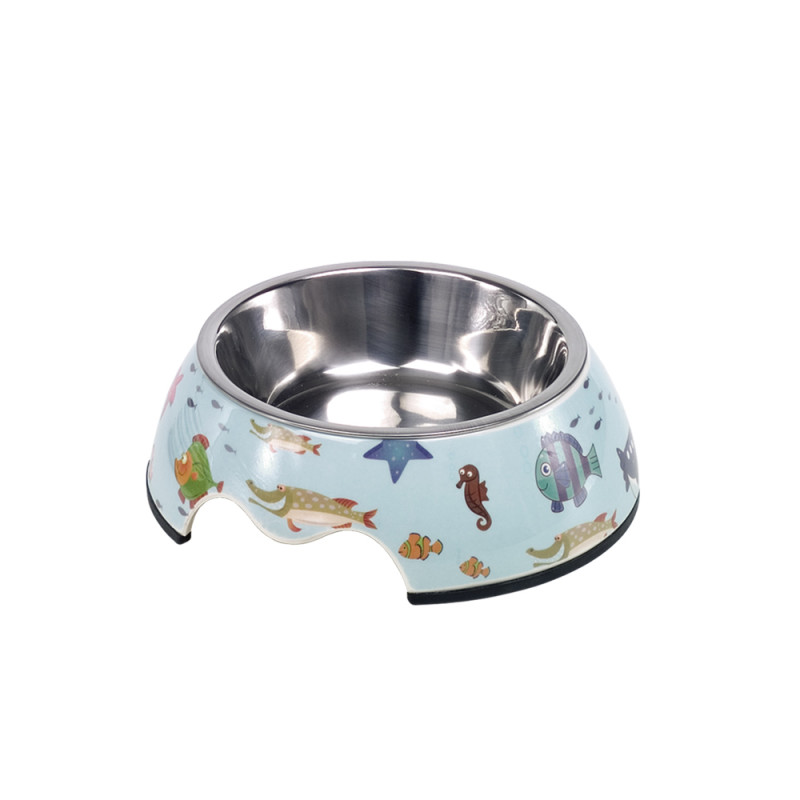 Антискользящая меламиновая миска для котов Подводный мир Fish - надежная и безопасная миска для вашего любимца. Миска сочетает в себе меламиновый съемный корпус с яркими морскими узорами и чашу из нержавеющей стали, устойчивую к ударам, которую невозможно разбить или сломать, что обеспечивает долговечность использования и безопасность для вашего четвероногого друга. Миска не поглощает запахов пищи, не меняет вкус блюд и абсолютно нетоксична. Антискользящее дно с силиконовым кольцом обеспечит устойчивость миски на полу. Модель "Fish" можно использовать в посудомоечной машине.