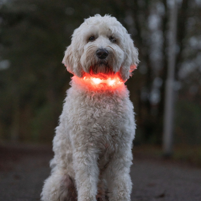Светящийся ошейник LED Visible Collar выпускается в трех цветах и трех размерах в соответствии с обхватом шеи и размером породы собаки.