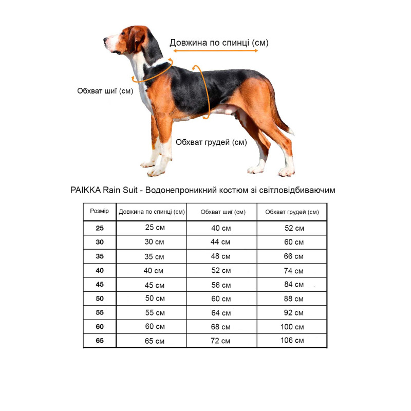 размер костюма PAIKKA, измерьте спину собаки от шеи до основания хвоста. Если