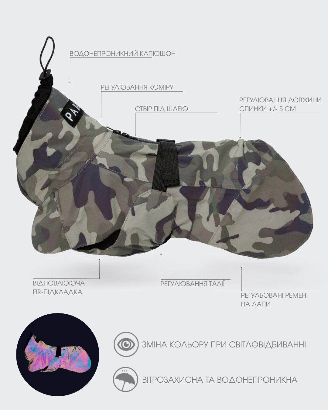 PAIKKA Recovery Raincoat Camo Дождевик для собак со специальной FIR-покладкой и меняющий цвет при светоотражении
