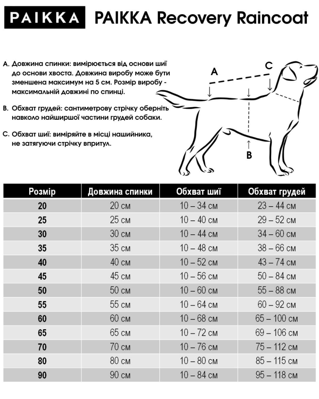Чтобы определить базовый размер дождевика PAIKKA, измерьте спину собаки от шеи до основания хвоста. Если ваш любимец находится между двумя размерами, мы рекомендуем выбрать больший размер. Обратите внимание, что размеры на таблице размеров являются максимальными.