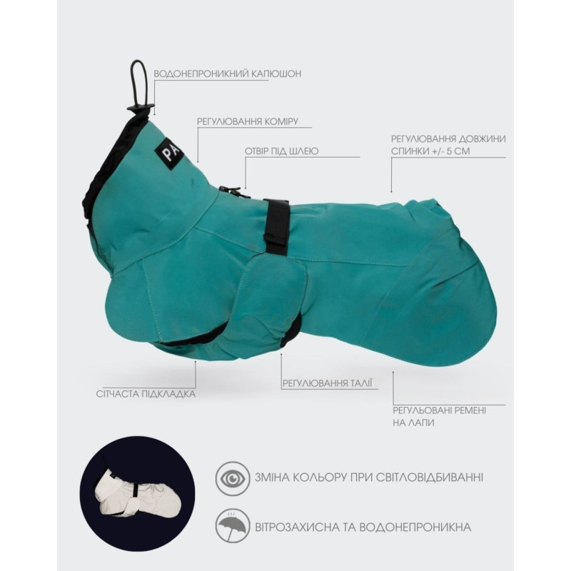 PAIKKA Visibility Raincoat Lite Emerald Водонепроницаемый дождевик для собак с антибактериальной подкладкой и неоновым светоотражением