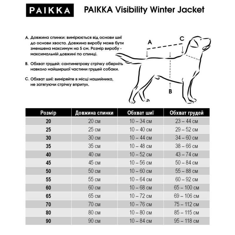 Чтобы определить базовый размер куртки PAIKKA, измерьте спину собаки от шеи до основания хвоста. Если ваш любимец находится между двумя размерами, мы рекомендуем выбрать больший размер. Обратите внимание, что размеры на таблице размеров являются максимальными.