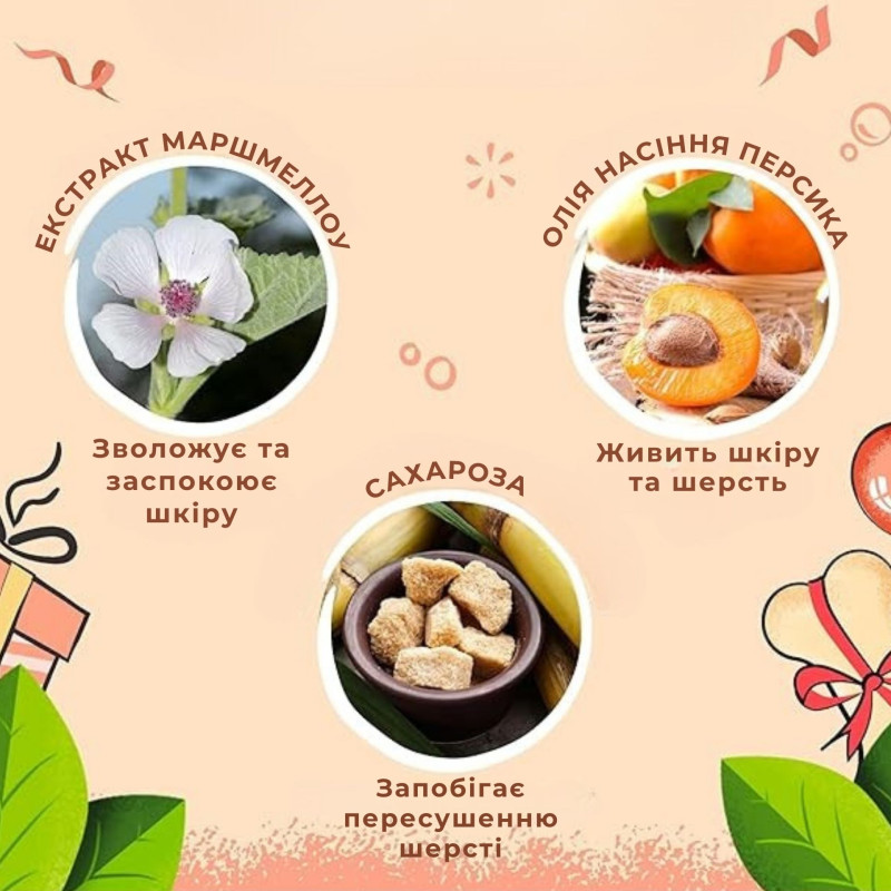 успокаивает кожу и освежает шерсть, оставляя приятный аромат сахарной ваты с