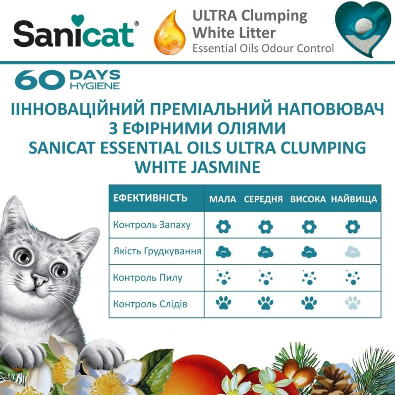 Sanicat Essential Oils Ultra Clumping White Jasmine Ультракомкующийся белый наполнитель для котов с эфирным маслом жасмина