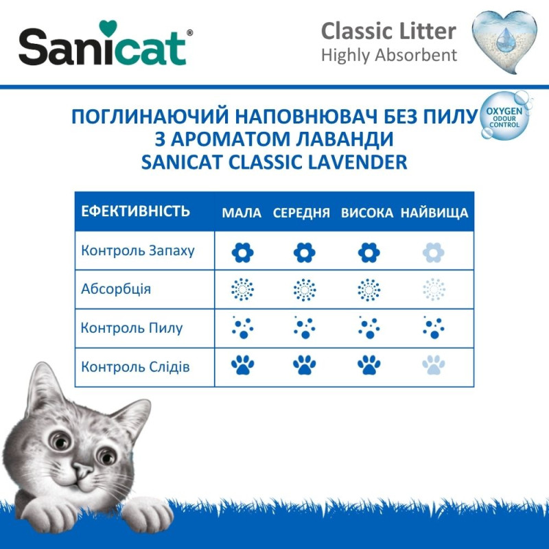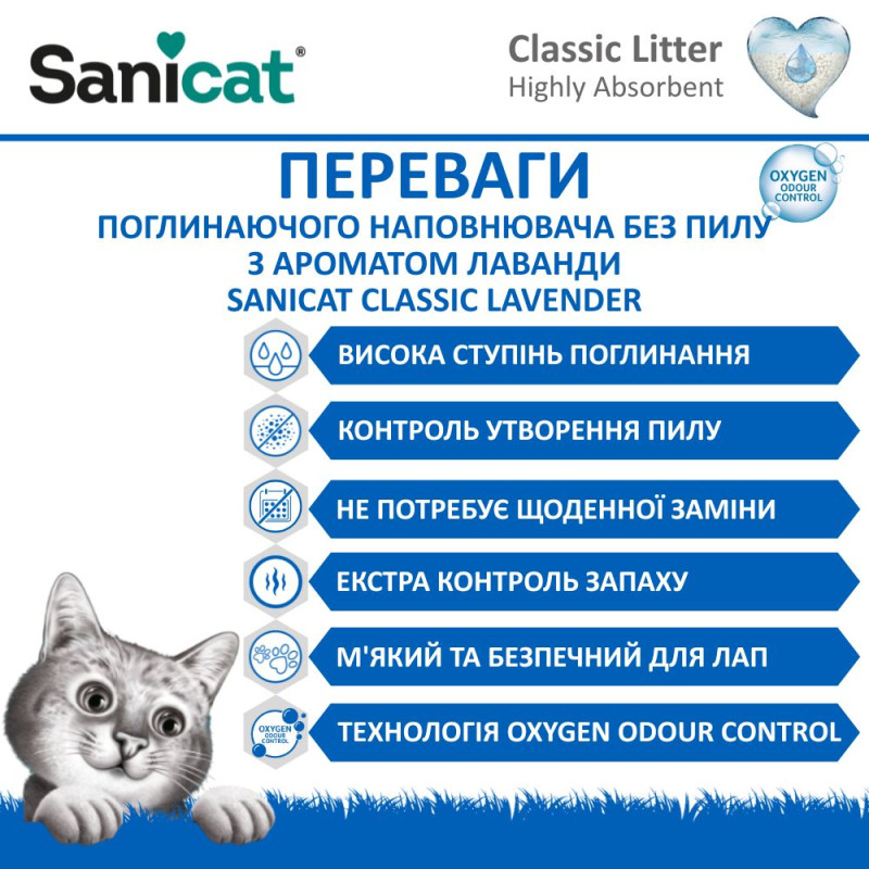 Мінеральний поглинаючий антибактеріальний наповнювач для котів з ароматом лаванди Sanicat Classic Lavender  - це коли тривала чистота, комфорт і сучасні технології об’єднуються у кожній гранулі!