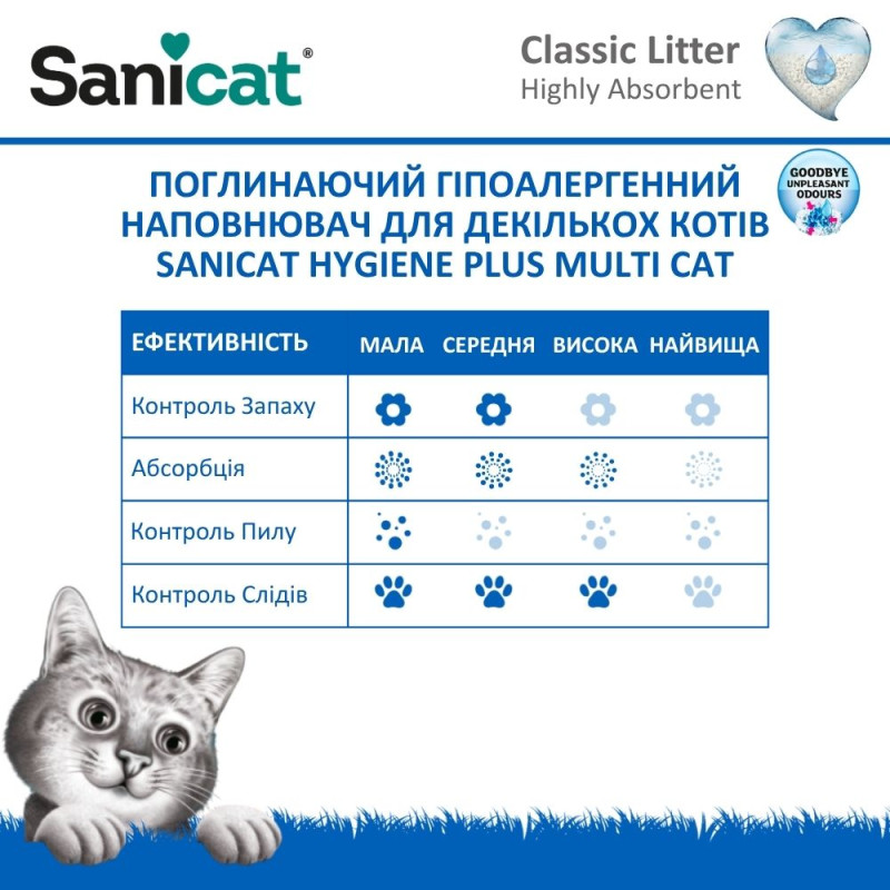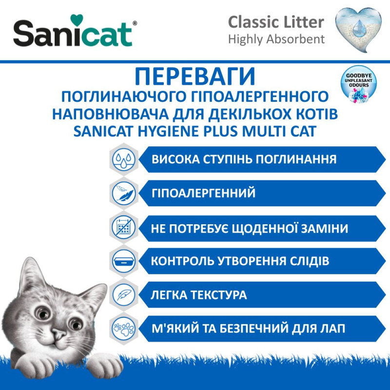 Sanicat Hygiene Plus Multi Cat Поглинаючий гіпоалергенний наповнювач для декількох котів, що не прилипає до лап