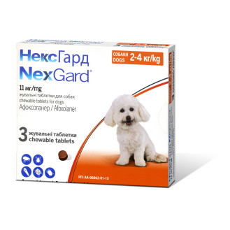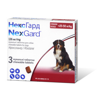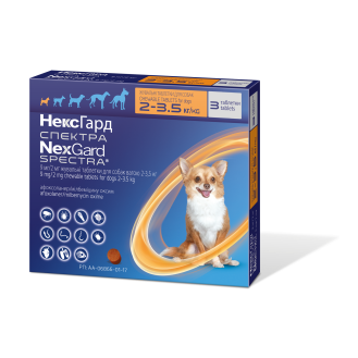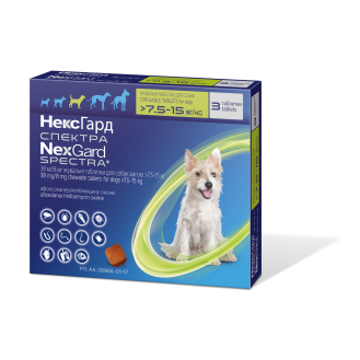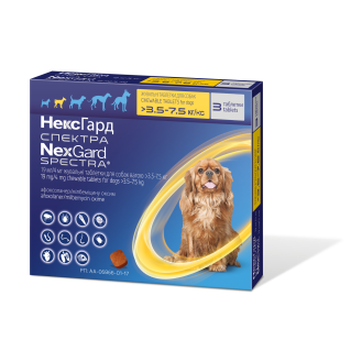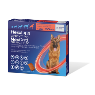 NexGard Spectra - жувальна таблетка для собак проти найбільш поширених зовнішніх і внутрішніх паразитів собак. NexGard Spectra крім дії на зовнішніх паразитів, бореться проти гельмінтів - аскарид, волосоголовців, анкілостом, а також захищає собак від дирофіляріозу. Склад 1 г препарату містить діючі речовини: афоксоланер - 18,75 мг; мільбеміцін оксим - 3,75 мг; допоміжні речовини. Опис Препарат являє собою таблетки від світло-рожевого до темно-рожевого кольору, круглої або прямокутної форми. Випускається в п'яти дозах (таблетки по 0.5 г, 1 г, 2 г, 4 г, 8 г) розфасованими по 3 таблетки в блістери та упаковані в картонні коробки. Умови зберігання Зберігають препарат в закритій заводській упаковці, при температурі від 0 С до 30 С. Застосування Лікування акарози собак, які викликані кліщами та блохами, лікування собак при зараженні шлунково-кишковими нематодами, комплексна терапія алергічного дерматиту, профілактика дирофіляріозу собак. Протипоказання Протипоказанням до застосування є підвищена індивідуальна чутливість тварини до діючих речовин (компонентів) препарату. Не застосовувати хворим і ослабленим тваринам. Не застосовувати цуценятам до 8 тижневого віку і масою тіла до 2 кг. Не застосовувати іншим тваринам, крім собак. Дози та порядок застосування Препарат NexGard Spectra застосовується перорально, одноразово в дозі 2,5 - 5,36 мг (залежно від маси тіла собаки) афоксоланера та 0,5 - 1,07 мг мільбеміціна оксима на 1 кг маси тіла тварини. Для собак масою тіла більше 60 кг використовується комбінація таблеток різної ваги. NexGard Spectra може використовуватися в якості сезонного лікування проти бліх та кліщів (замінюючи лікування моновалентним препаратом) у собак з встановленим діагнозом шлунково-кишкових нематодозів. Одноразове застосування препарату є ефективним при лікуванні шлунково-кишкових нематодозів. Після проведеного лікування нематодозів наступна обробка тварин проти бліх та кліщів проводиться моновалентними препаратами. З метою профілактики дирофіляріозу в небезпечних регіонах препарат NexGard Spectra застосовують у весняно-літньо-осінній період щомісяця, починаючи за місяць до початку літа, до появи переносників збудника - москітів і комарів, і закінчують не раніше, ніж через місяць після завершення літа. Якщо тварині застосовували інший препарат, який захищає від дірофілярій, перше застосування препарату NexGard Spectra необхідно починати через 1 місяць після останньої обробки попереднім препаратом. Перед обробкою препаратом для профілактики дирофіляріозу, рекомендується провести обстеження собак віком старше 8 місяців на присутність в організмі статевозрілих дірофілярій. Не допускається розламування таблеток. NexGard Spectra має приємний аромат і смак і, як правило, добре поїдається собаками, в протилежному випадку, препарат згодовують з кормом. Необхідно переконатися, що собака повністю проковтнула необхідну дозу препарату...