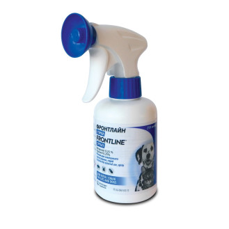 Інсектоакаріцидний спрей від зовнішніх паразитів для цуценят та кошенят Фронтлайн Boehringer Ingelheim Frontline Spray - це ветеринарний препарат у формі спрею для надійного захисту собак і котів від бліх, кліщів, волосоїдів та вошей. Засіб діє контактно: паразити гинуть після контакту з шерстю та шкірою, обробленою препаратом.Принцип дії спрею для собак від бліх та кліщів ФронтлайнФіпроніл, що входить до складу спрею, має виражену інсектицидну та акарицидну дію відносно бліх, волосоїдів та іксодових кліщів на всіх стадіях розвитку, що паразитують на собаках і кішках. При нанесенні на шкірно-волосяний покрив препарат практично не всмоктуючись через шкіру, накопичується в епідермісі і сальних залозах тварини і виявляє контактну інсектоакарицидну дію на ектопаразитів.Переваги спрею для собак від бліх та кліщів Frontline:ефективний захист від бліх, кліщів, волосоїдів та вошей;швидка дія після нанесення;підходить як для собак, так і для котів;безпечний для цуценят і кошенят з 2-х днів життя;зручне нанесення у вигляді спрею;довготривалий захист (до 3 місяців від бліх, до 1 місяця від кліщів).Склад та безпечність спрею Фронтлайн:Діюча речовина: фіпроніл 0,25%Принцип дії: Фіпроніл діє на нервову систему паразитів, що призводить до їхньої загибелі, але є безпечним для тварин при правильному застосуванні.Спосіб застосування та дозування спрею Frontline:Спрей Фронтлайн застосовують проти комах та іксодових кліщів, які паразитують на собаках і кішках шляхом аерозольного нанесення на шкіру тварини. Обробку проводять на відкритому повітрі або в добре провітрюваному приміщенні. Перед обробкою флакон ретельно струшують і, натискаючи на розпилюючу головку, направляють факел аерозолі з відстані 10-20 см на тулуб тварини проти росту волосся. Флакон слід тримати вертикально, оббризкуючи тіло тварини, включаючи живіт, шию і кінцівки препаратом, щоб він рівномірно змочив шкірно-волосяний покрив, після цього, щоб прискорити його проникнення в шкіру, препарат слід злегка втерти (рекомендується використовувати гумові рукавички). Для запобігання попадання в очі, навколо очей препарат наносять змоченою тканиною. При обприскуванні довгошерстих тварин шерсть піднімають рукою, направляючи аерозоль проти росту волосся. Доза препарату становить 3-6 мл на 1 кг маси тварини в залежності від довжини шерсті.Препарат легко дозується: одне натискання на розпилюючу головку флакона місткістю 100 мл забезпечує дозу 0,5 мл; одне натискання на розпилюючу головку флакона місткістю 250 мл забезпечує дозу 1,5 мл; Повторні обробки тварин проводять за показаннями, але не частіше 1 разу на три місяці проти комах і не більше 1 разу на місяць проти іксодових кліщів. Заходи безпеки:До повного висихання шерсті не можна дозволяти тваринам злизувати препарат, підпускати їх до відкритого вогню і нагрівальних приладів. Протягом 24 годин після обробки спреєм від бліх та кліщів не слід гладити тварину, купати і підпускати її до маленьких дітей. З метою запобігання вилуплення бліх і повторної інвазії, тваринам замінюють підстилку та обробляють місце відпочинку спреєм для обробки приміщень. Не застосовувати хворим і ослабленим тваринам без консультації ветеринара.Побічні дії:Побічних явищ і ускладнень при застосуванні препарату Фронтлайн-спрей не відзначається.Форма випуску та умови зберігання:Препарат