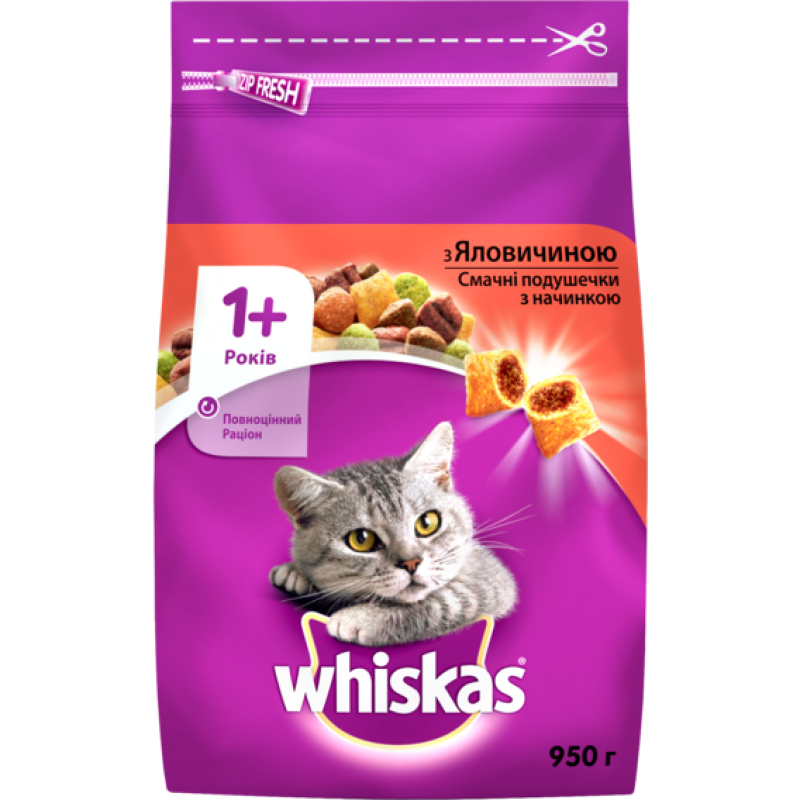 Whiskas Adult 1+ Delicious Pillows with Beef Сухий корм для котів Смачні подушечки з яловичиною